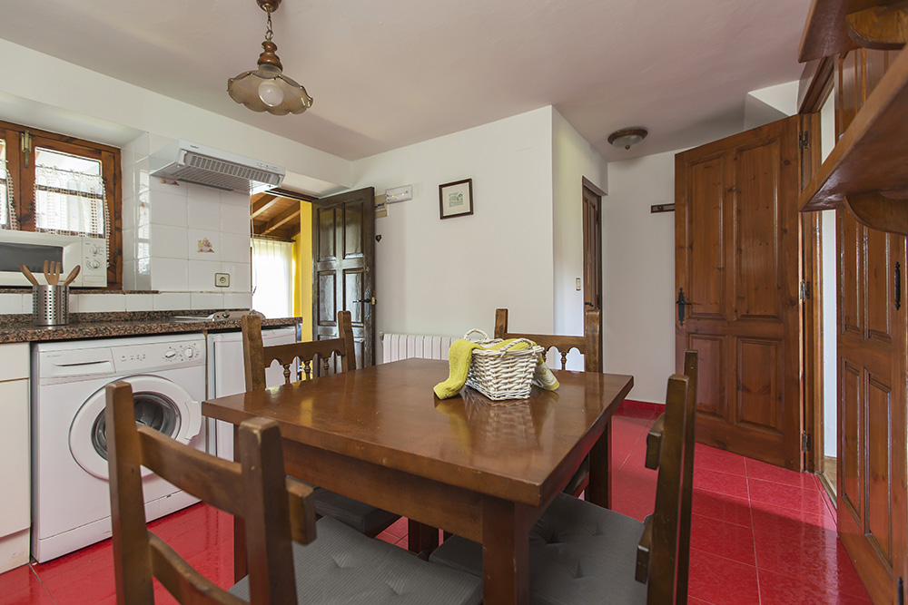 Cocina equipada con lavadora, frigorífico, microondas y menaje de cocina.